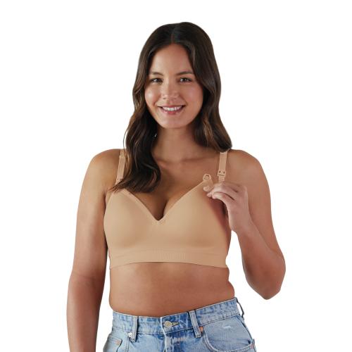 Bravado Plunge Nursing Bra is a sleek, structured, wire-free design and provides a smooth contour without compromising flexibility. With a luxuriously soft, seamless stretch fabric and sewn-in foam cups, this design adjusts to your body and hugs your shape throughout pregnancy and nursing for 24/7, 365 wear. Featuring a low-cut, plunge v-neckline and modern silhouette, it will make you wonder, is this really a nursing bra? Soft, comfy stretch band makes this a favorite of our moms for maternity & nursing. Choose Butterscotch in S, M, L, XL.