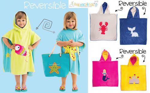 FlapJack Kids reversible kids cover ups offer UPF 50+ sun protection and are soft, cozy and absorbent. A cute design on the front, a clever imprinted saying on the back and a reversible hood make these a kid favorite. Great for beach, pool or bathtime from toddler to preschool. Machine washable 100% Polyester Microfiber. Reversible cover-up features 3 adorable patterns: Starfish/Fish, Whale/Lobster, & Mermaid/Sandcastle.