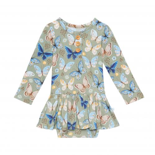 Posh Peanut Lucy Butterfly Long Sleeve Henley Twirl Skirt Bodysuit--Long sleeve bodysuit with henley neckline with wood buttons and twirl skirt detail. Pair it with your fave shorties, pants, and more. Long sleeve bodysuit is great for fall and winter. 3-snap closure for easy diaper changes. Lucy is a boutique exclusive print. Soft, stretchy 95% Viscose from Bamboo, 5% Spandex. 0-3 months. Headband sold separately.